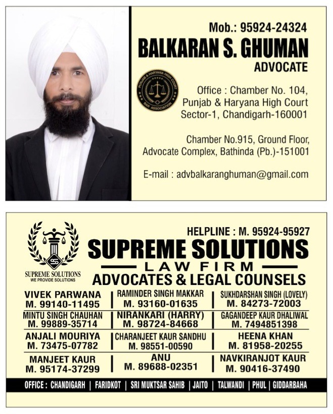 Advocate Balkaran Singh Ghuman has completed his law degree in 2016 and was enrolled as an Advocate on the Rolls of the Punjab and Haryana High Court Bar Council in 2016. He has since built a robust practice, appearing in District Courts, as well as on the Original and Appellate sides of the High Court of Punjab and Haryana, and the Supreme Court of India.His legal expertise spans a wide spectrum, including Criminal Law, Constitutional Law, Arbitration Law, Civil Contracts, Consumer Laws, Succession Law, Family Law, Matters relating to Transfer of Property law including Tenancies, Rent Control, Labour and Services Law, among others.